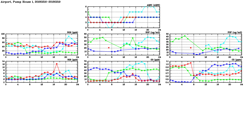 | Air Quality Data Time Series in Airport, Pump House 1 (2018/02/19) | ( Line colors: Day -3 Day -2 Day -1 Current day ) | 2D Map Current AQHI |