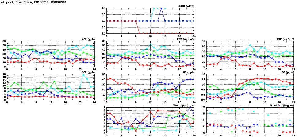 | Air Quality Data Time Series in Airport, Sha Chau (2018/02/22) | ( Line colors: Day -3 Day -2 Day -1 Current day ) | 2D Map Current AQHI |