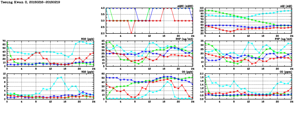 | Air Quality Data Time Series in Tseung Kwan O (2018/02/19) | ( Line colors: Day -3 Day -2 Day -1 Current day ) | 2D Map Current AQHI |