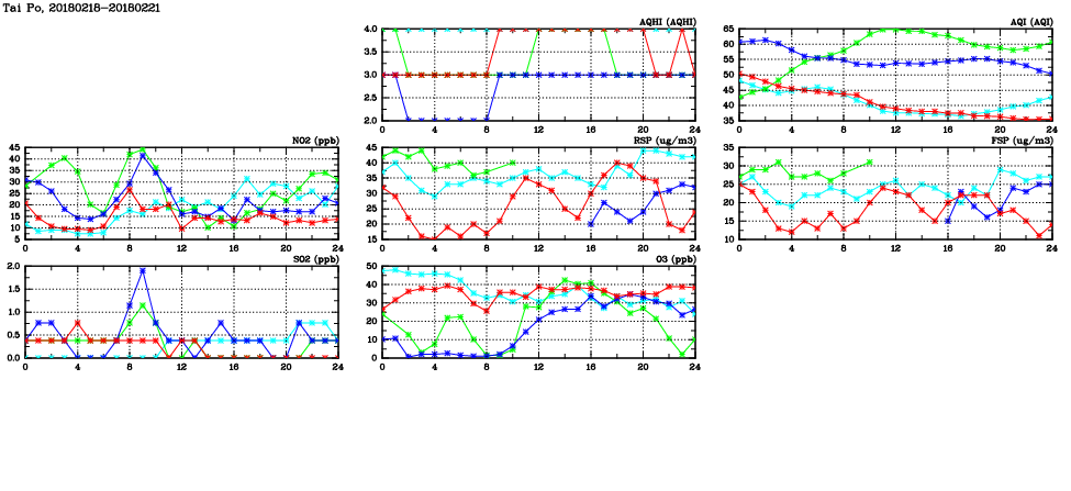 | Air Quality Data Time Series in Tai Po (2018/02/21) | ( Line colors: Day -3 Day -2 Day -1 Current day ) | 2D Map Current AQHI |