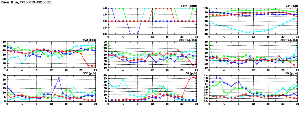 | Air Quality Data Time Series in Tuen Mun (2018/02/21) | ( Line colors: Day -3 Day -2 Day -1 Current day ) | 2D Map Current AQHI |