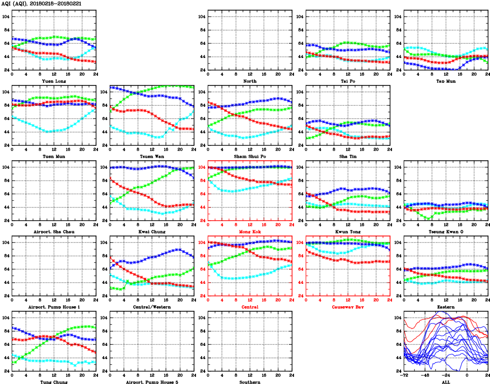 | Air Quality Data Time Series for AQI (2018/02/21) | ( Line colors: Day -3 Day -2 Day -1 Current day ) | 2D Map Current AQHI |