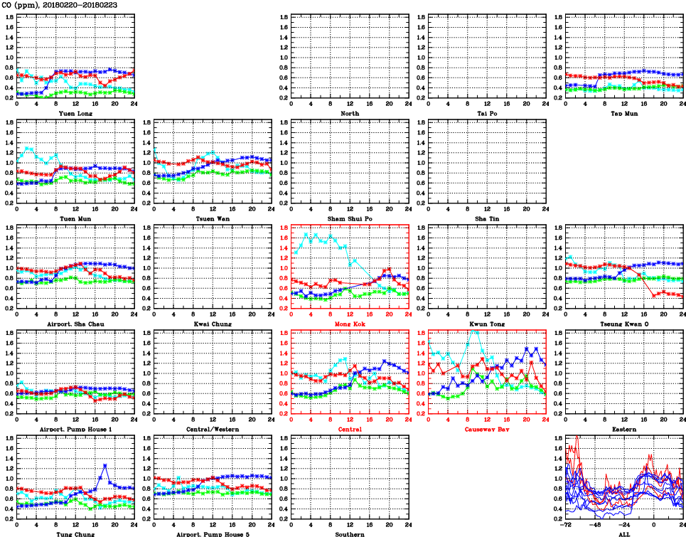 | Air Quality Data Time Series for CO (2018/02/23) | ( Line colors: Day -3 Day -2 Day -1 Current day ) | 2D Map Current AQHI |
