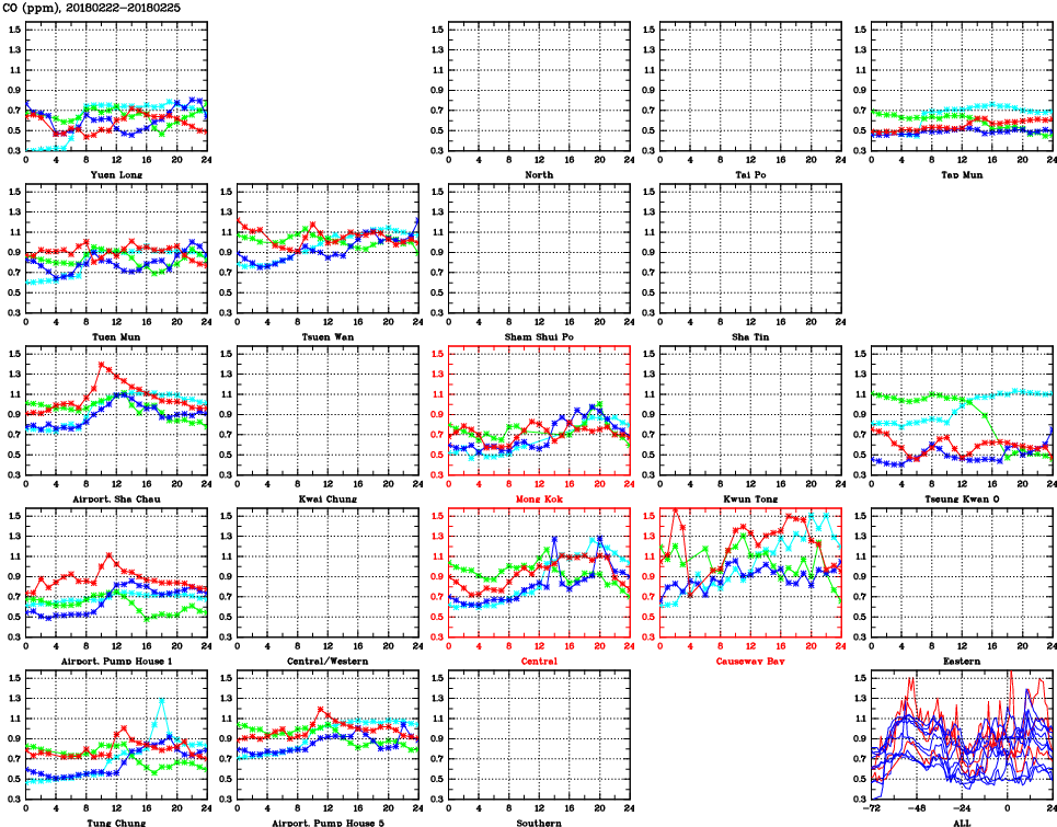 | Air Quality Data Time Series for CO (2018/02/25) | ( Line colors: Day -3 Day -2 Day -1 Current day ) | 2D Map Current AQHI |