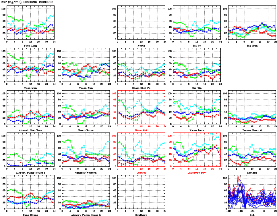 | Air Quality Data Time Series for RSP (2018/02/19) | ( Line colors: Day -3 Day -2 Day -1 Current day ) | 2D Map Current AQHI |