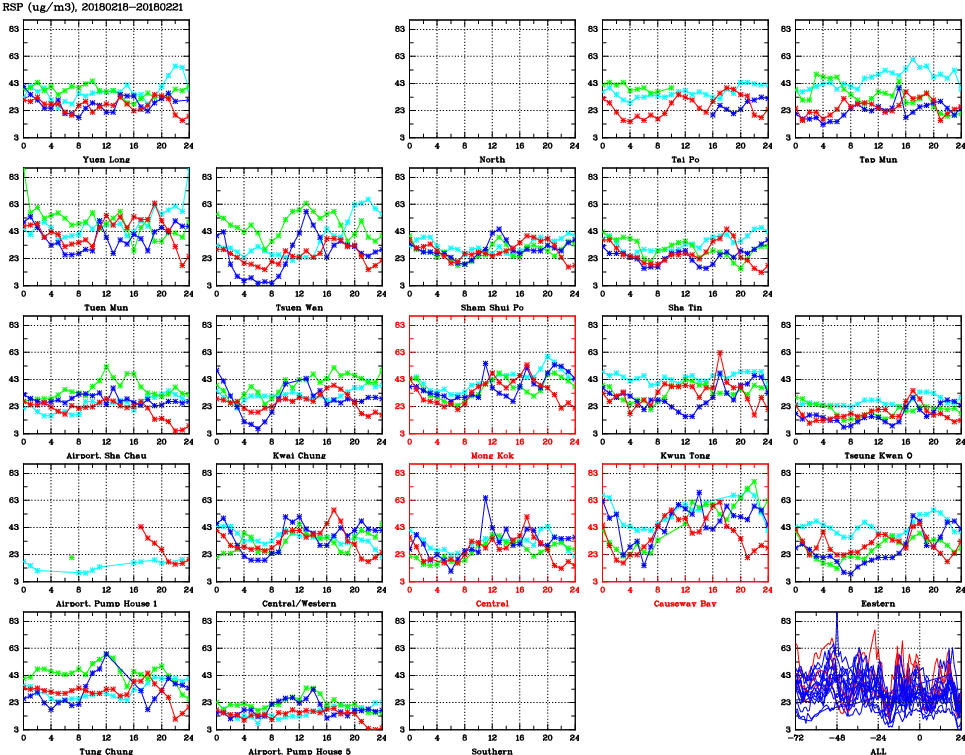 | Air Quality Data Time Series for RSP (2018/02/21) | ( Line colors: Day -3 Day -2 Day -1 Current day ) | 2D Map Current AQHI |