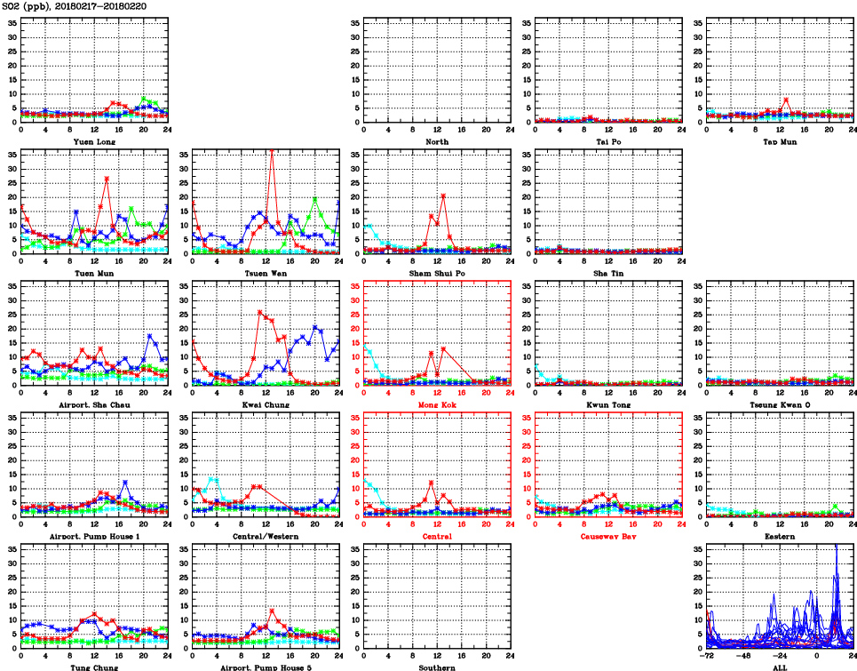 | Air Quality Data Time Series for SO2 (2018/02/20) | ( Line colors: Day -3 Day -2 Day -1 Current day ) | 2D Map Current AQHI |
