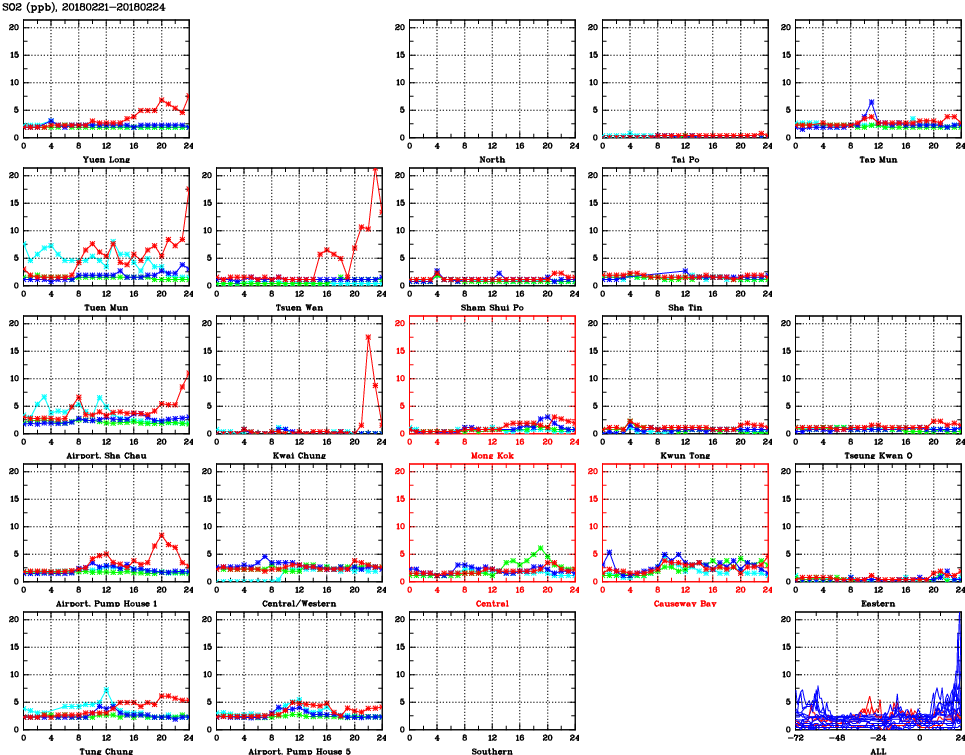 | Air Quality Data Time Series for SO2 (2018/02/24) | ( Line colors: Day -3 Day -2 Day -1 Current day ) | 2D Map Current AQHI |