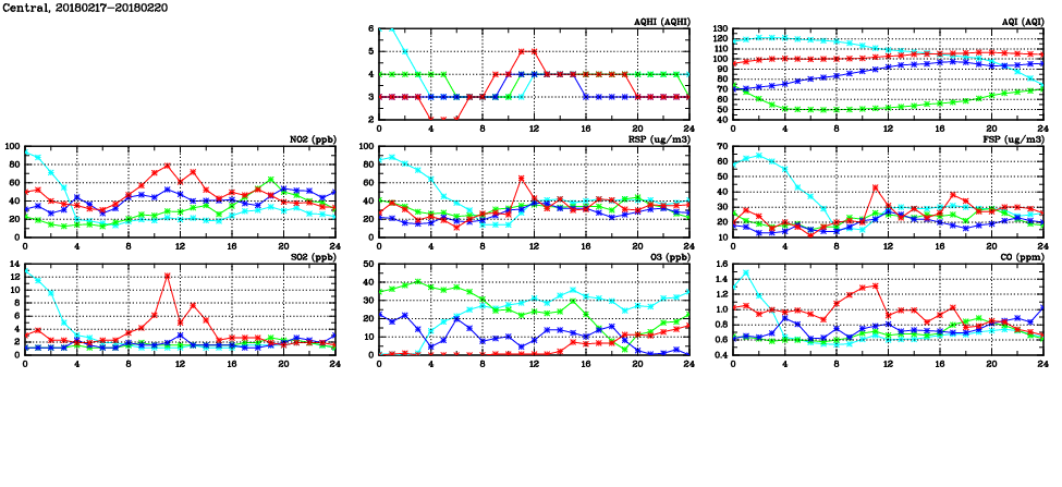 | Air Quality Data Time Series in Central (2018/02/20) | ( Line colors: Day -3 Day -2 Day -1 Current day ) | 2D Map Current AQHI |