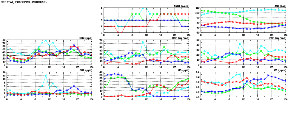 | Air Quality Data Time Series in Central (2018/02/23) | ( Line colors: Day -3 Day -2 Day -1 Current day ) | 2D Map Current AQHI |
