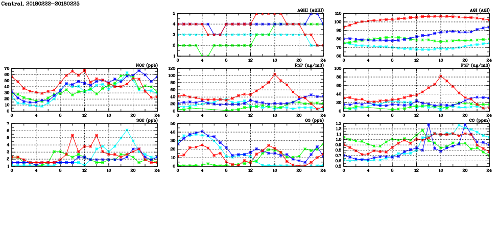 | Air Quality Data Time Series in Central (2018/02/25) | ( Line colors: Day -3 Day -2 Day -1 Current day ) | 2D Map Current AQHI |