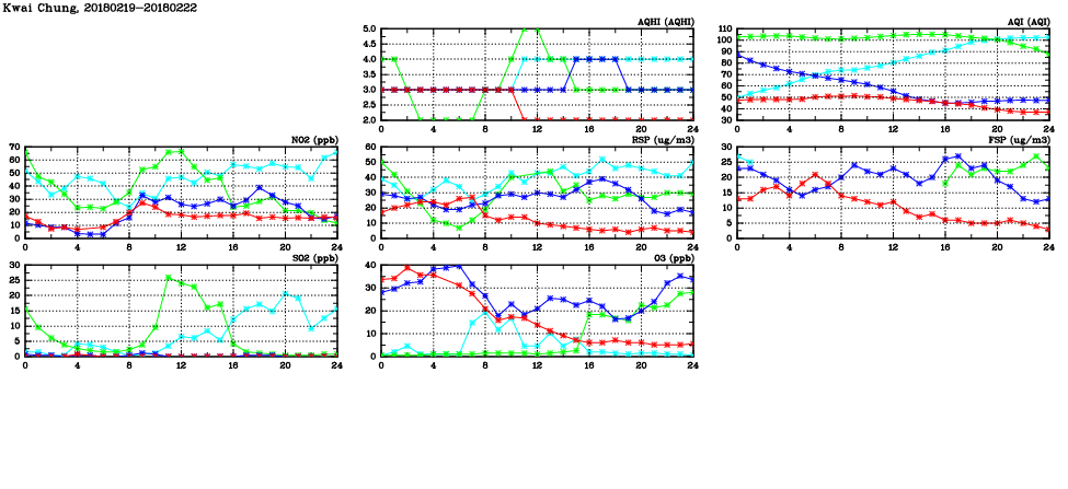 | Air Quality Data Time Series in Kwai Chung (2018/02/22) | ( Line colors: Day -3 Day -2 Day -1 Current day ) | 2D Map Current AQHI |