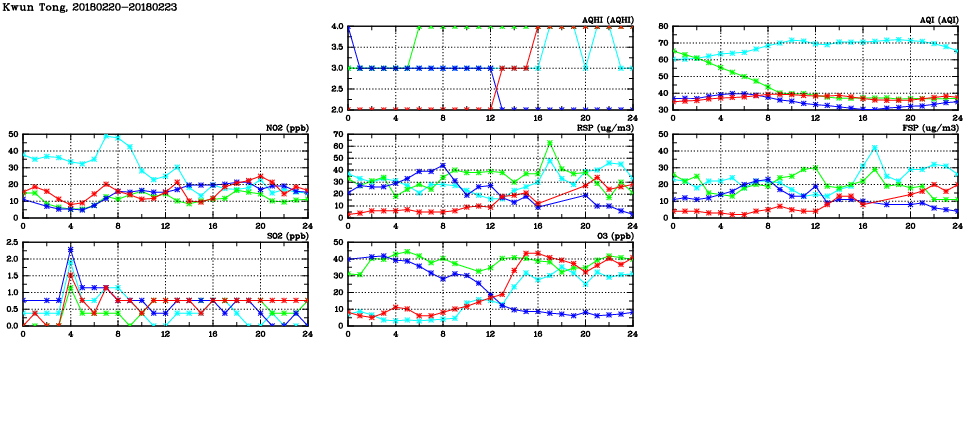 | Air Quality Data Time Series in Kwun Tong (2018/02/23) | ( Line colors: Day -3 Day -2 Day -1 Current day ) | 2D Map Current AQHI |