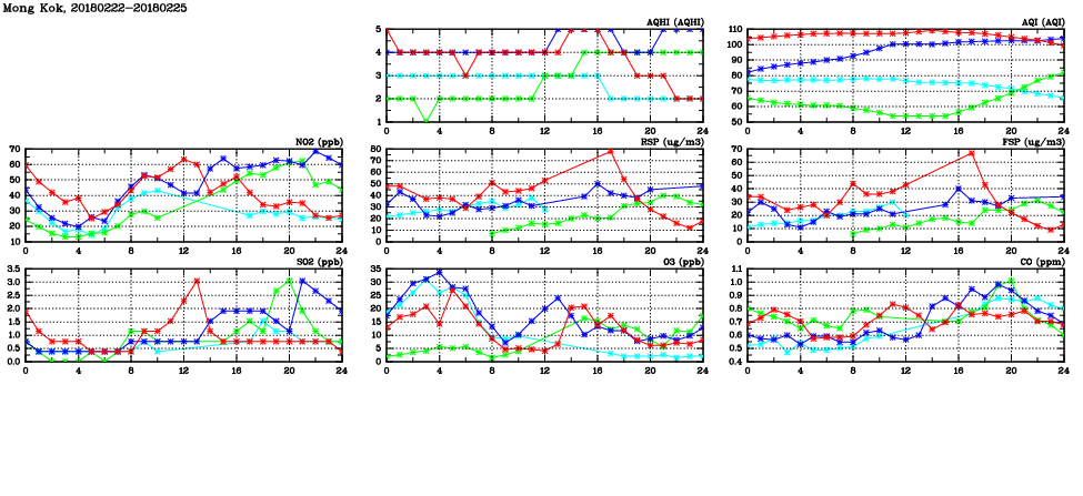 | Air Quality Data Time Series in Mong Kok (2018/02/25) | ( Line colors: Day -3 Day -2 Day -1 Current day ) | 2D Map Current AQHI |
