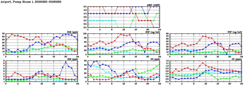 | Air Quality Data Time Series in Airport, Pump House 1 (2018/02/25) | ( Line colors: Day -3 Day -2 Day -1 Current day ) | 2D Map Current AQHI |