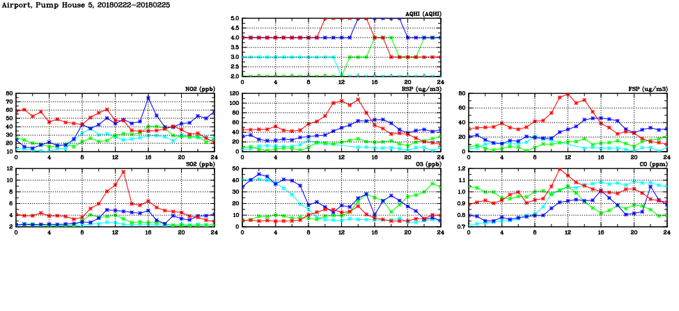 | Air Quality Data Time Series in Airport, Pump House 5 (2018/02/25) | ( Line colors: Day -3 Day -2 Day -1 Current day ) | 2D Map Current AQHI |
