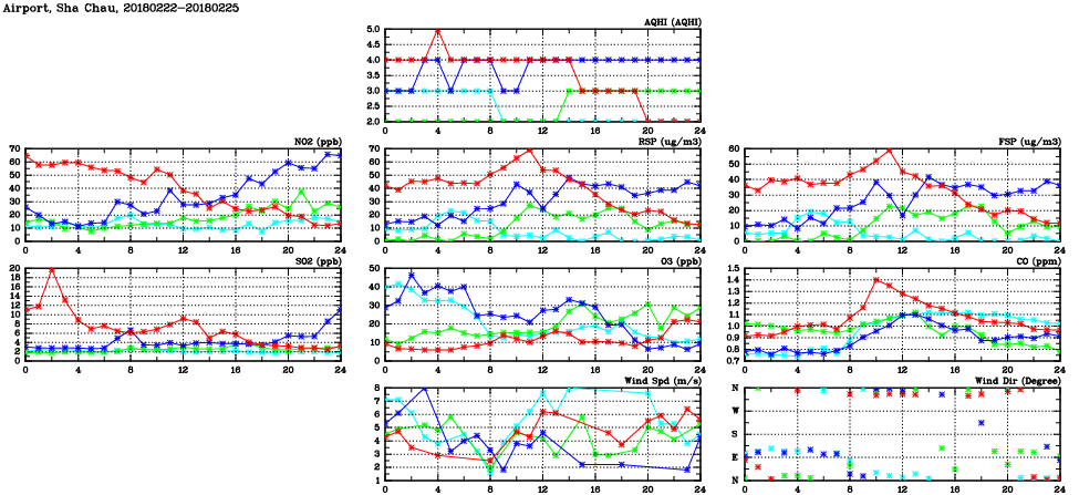 | Air Quality Data Time Series in Airport, Sha Chau (2018/02/25) | ( Line colors: Day -3 Day -2 Day -1 Current day ) | 2D Map Current AQHI |