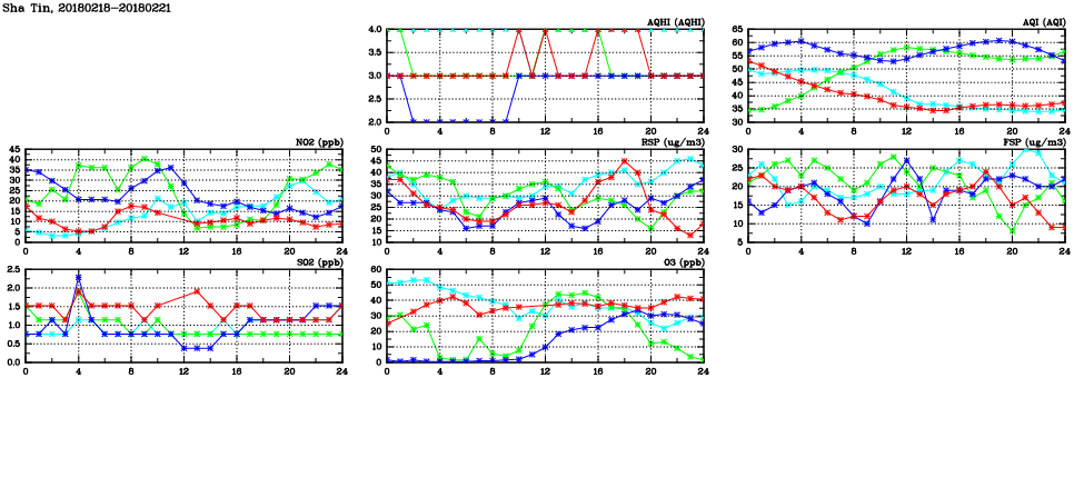 | Air Quality Data Time Series in Sha Tin (2018/02/21) | ( Line colors: Day -3 Day -2 Day -1 Current day ) | 2D Map Current AQHI |