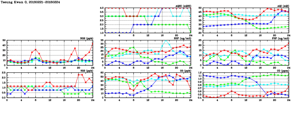 | Air Quality Data Time Series in Tseung Kwan O (2018/02/24) | ( Line colors: Day -3 Day -2 Day -1 Current day ) | 2D Map Current AQHI |