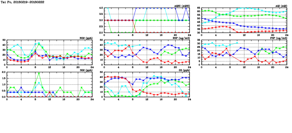 | Air Quality Data Time Series in Tai Po (2018/02/22) | ( Line colors: Day -3 Day -2 Day -1 Current day ) | 2D Map Current AQHI |
