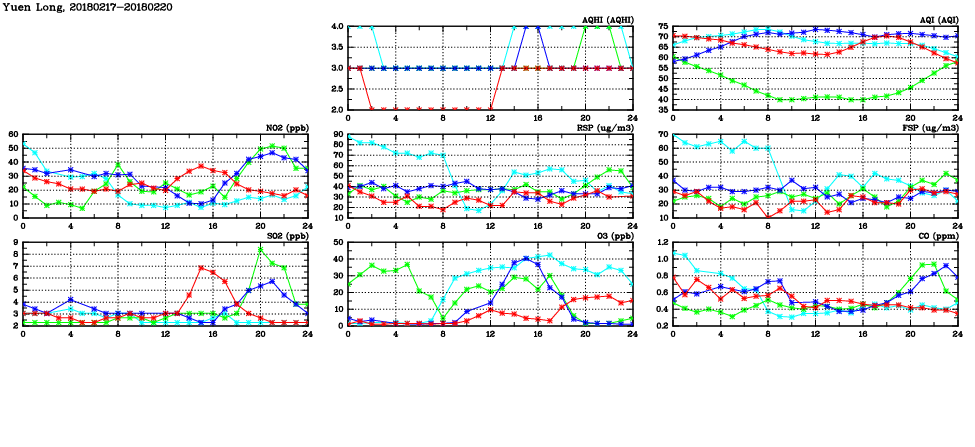 | Air Quality Data Time Series in Yuen Long (2018/02/20) | ( Line colors: Day -3 Day -2 Day -1 Current day ) | 2D Map Current AQHI |
