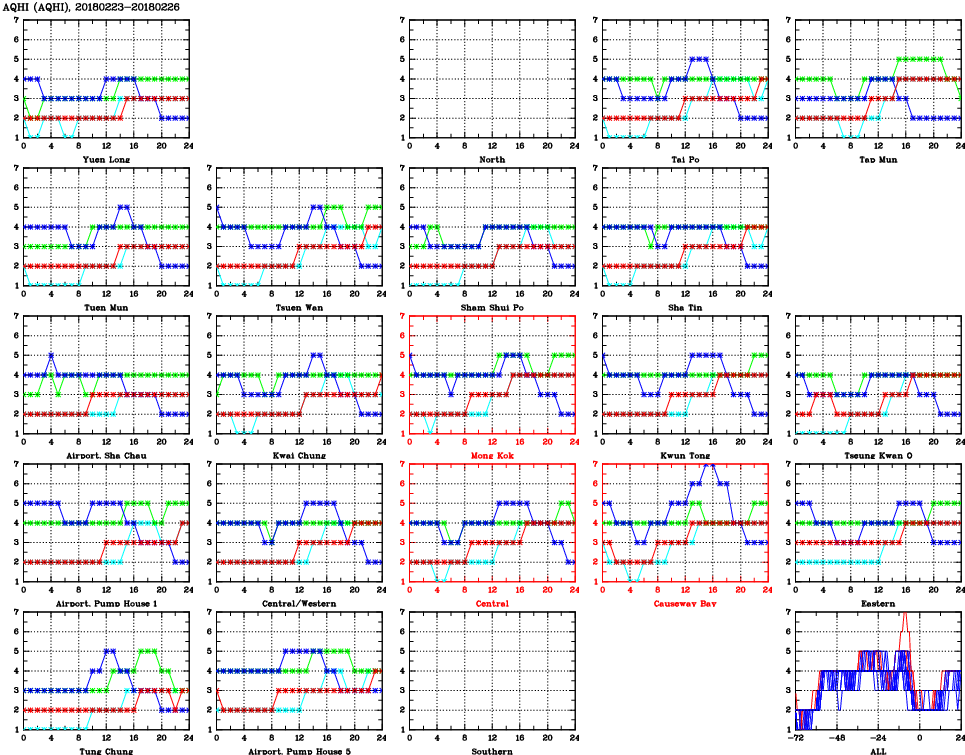 | Air Quality Data Time Series for AQHI (2018/02/26) | ( Line colors: Day -3 Day -2 Day -1 Current day ) | 2D Map Current AQHI |