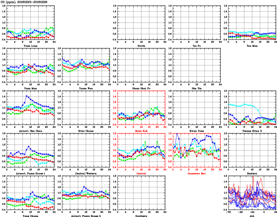 | Air Quality Data Time Series for CO (2018/02/26) | ( Line colors: Day -3 Day -2 Day -1 Current day ) | 2D Map Current AQHI |