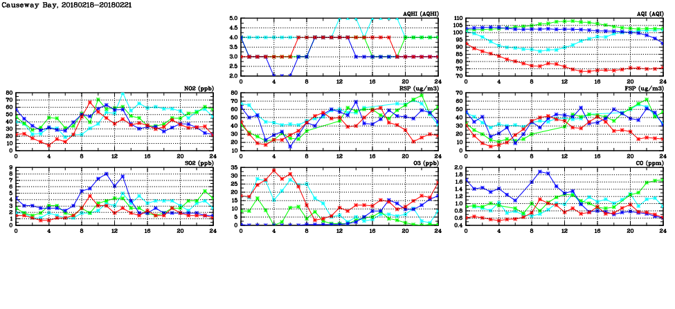 | Air Quality Data Time Series in Causeway Bay (2018/02/21) | ( Line colors: Day -3 Day -2 Day -1 Current day ) | 2D Map Current AQHI |