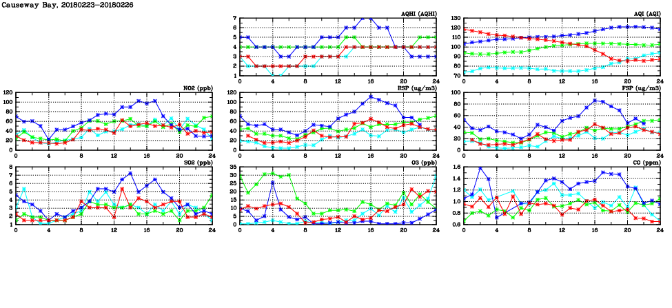 | Air Quality Data Time Series in Causeway Bay (2018/02/26) | ( Line colors: Day -3 Day -2 Day -1 Current day ) | 2D Map Current AQHI |