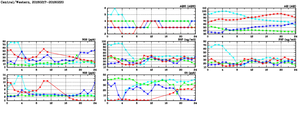 | Air Quality Data Time Series in Central/Western (2018/02/20) | ( Line colors: Day -3 Day -2 Day -1 Current day ) | 2D Map Current AQHI |