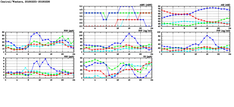 | Air Quality Data Time Series in Central/Western (2018/02/26) | ( Line colors: Day -3 Day -2 Day -1 Current day ) | 2D Map Current AQHI |