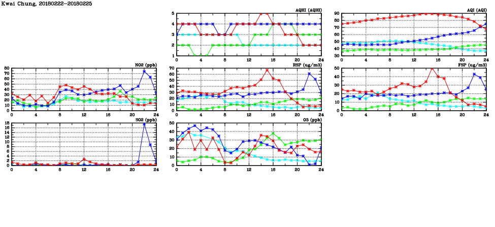 | Air Quality Data Time Series in Kwai Chung (2018/02/25) | ( Line colors: Day -3 Day -2 Day -1 Current day ) | 2D Map Current AQHI |
