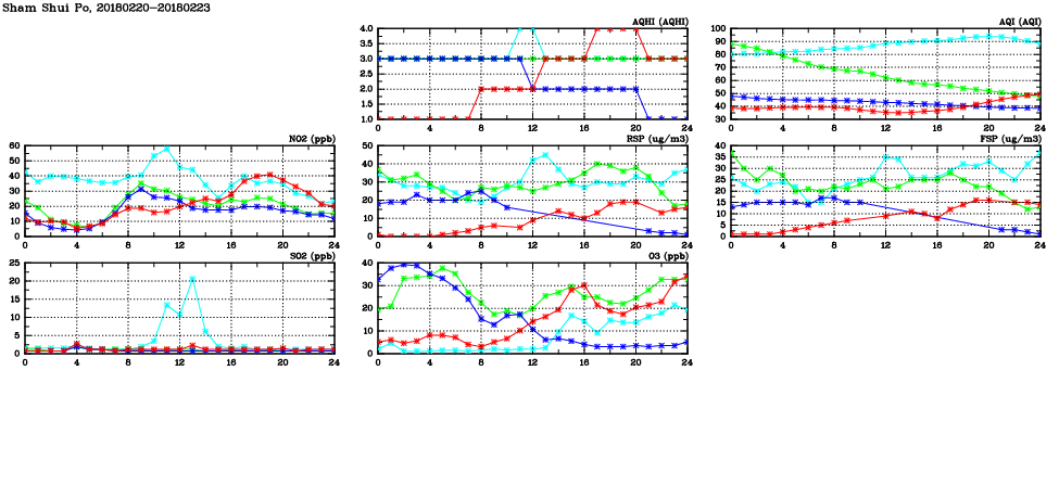 | Air Quality Data Time Series in Sham Shui Po (2018/02/23) | ( Line colors: Day -3 Day -2 Day -1 Current day ) | 2D Map Current AQHI |