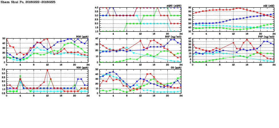 | Air Quality Data Time Series in Sham Shui Po (2018/02/25) | ( Line colors: Day -3 Day -2 Day -1 Current day ) | 2D Map Current AQHI |
