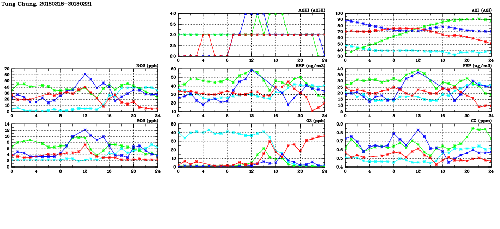 | Air Quality Data Time Series in Tung Chung (2018/02/21) | ( Line colors: Day -3 Day -2 Day -1 Current day ) | 2D Map Current AQHI |