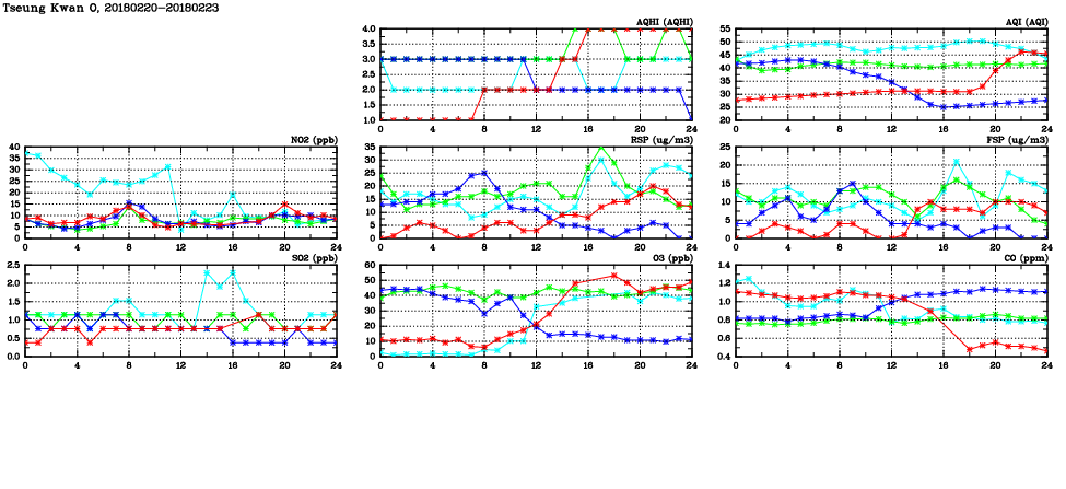| Air Quality Data Time Series in Tseung Kwan O (2018/02/23) | ( Line colors: Day -3 Day -2 Day -1 Current day ) | 2D Map Current AQHI |