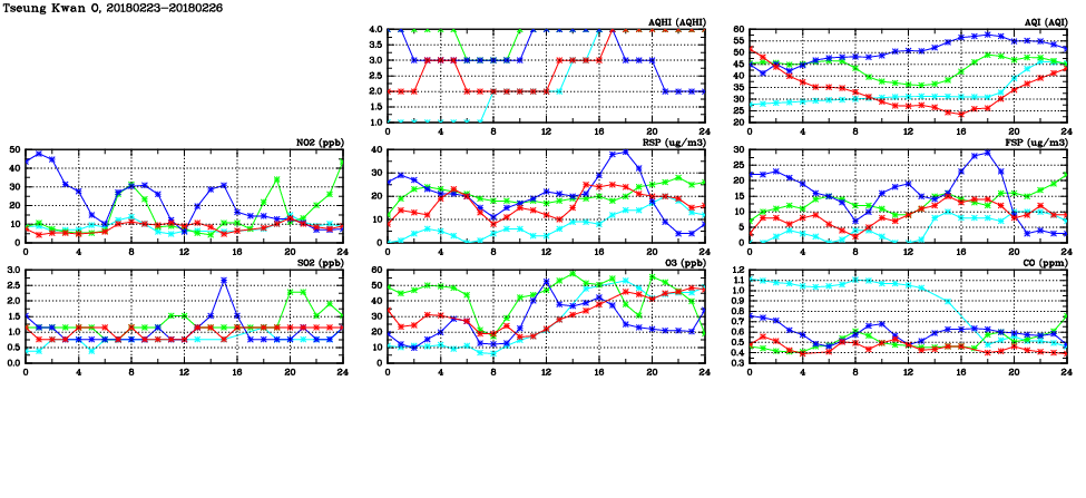 | Air Quality Data Time Series in Tseung Kwan O (2018/02/26) | ( Line colors: Day -3 Day -2 Day -1 Current day ) | 2D Map Current AQHI |