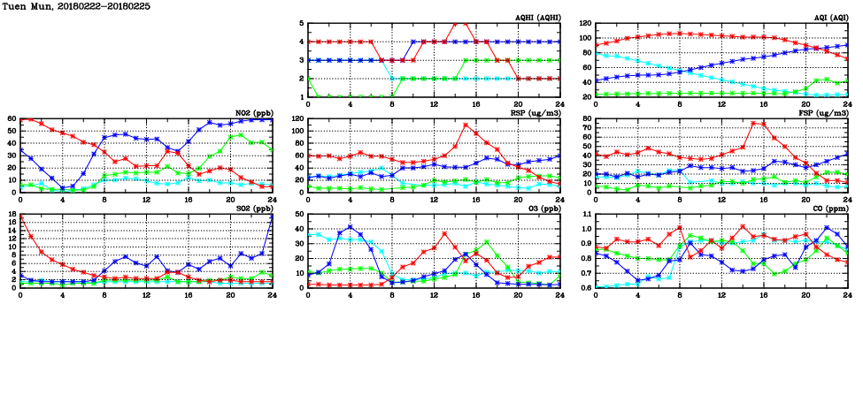 | Air Quality Data Time Series in Tuen Mun (2018/02/25) | ( Line colors: Day -3 Day -2 Day -1 Current day ) | 2D Map Current AQHI |