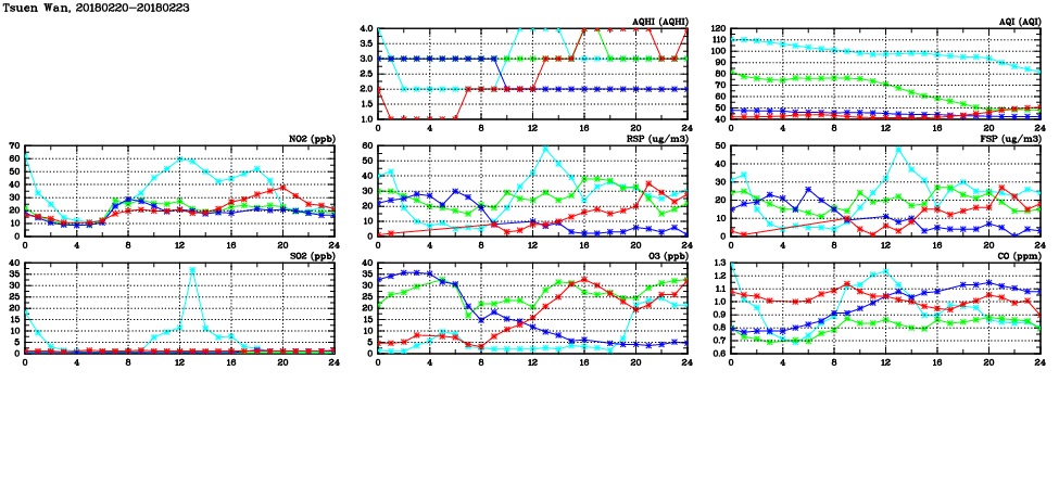 | Air Quality Data Time Series in Tsuen Wan (2018/02/23) | ( Line colors: Day -3 Day -2 Day -1 Current day ) | 2D Map Current AQHI |