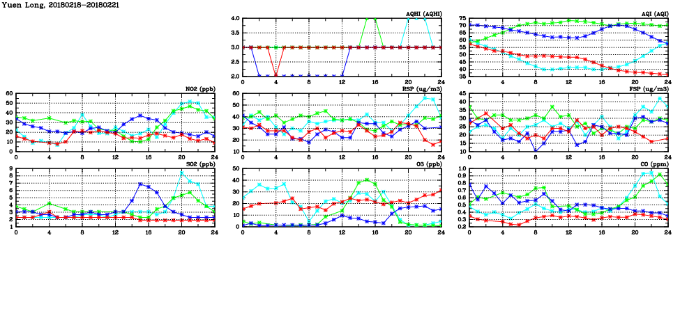 | Air Quality Data Time Series in Yuen Long (2018/02/21) | ( Line colors: Day -3 Day -2 Day -1 Current day ) | 2D Map Current AQHI |