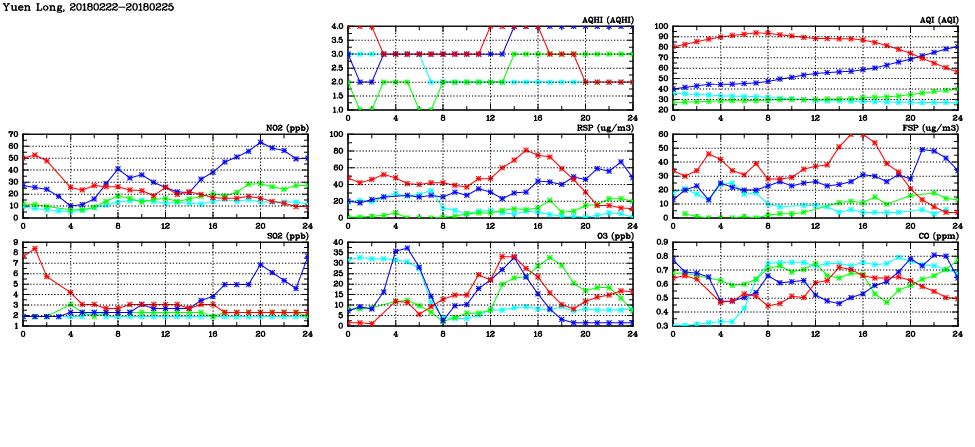 | Air Quality Data Time Series in Yuen Long (2018/02/25) | ( Line colors: Day -3 Day -2 Day -1 Current day ) | 2D Map Current AQHI |