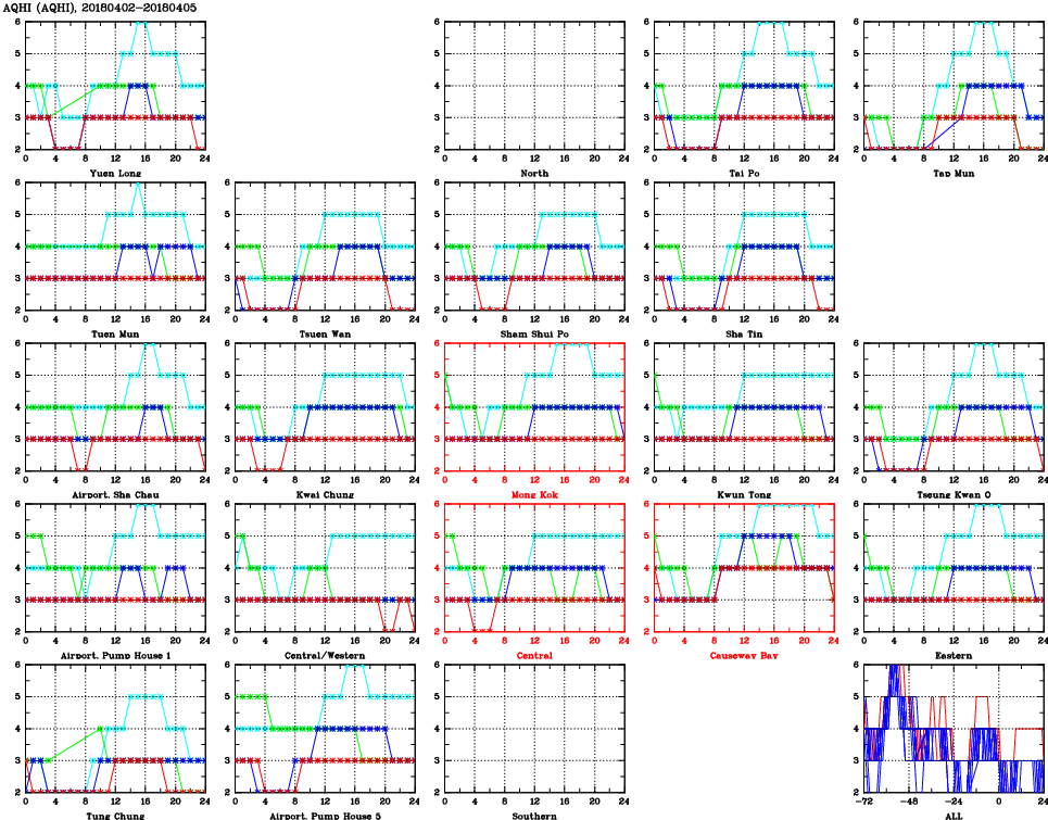 | Air Quality Data Time Series for AQHI (2018/04/05) | ( Line colors: Day -3 Day -2 Day -1 Current day ) | 2D Map Current AQHI |