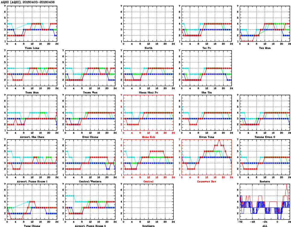 | Air Quality Data Time Series for AQHI (2018/04/06) | ( Line colors: Day -3 Day -2 Day -1 Current day ) | 2D Map Current AQHI |