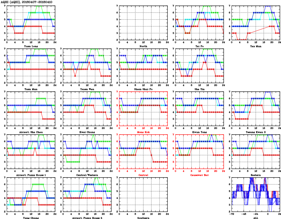 | Air Quality Data Time Series for AQHI (2018/04/10) | ( Line colors: Day -3 Day -2 Day -1 Current day ) | 2D Map Current AQHI |
