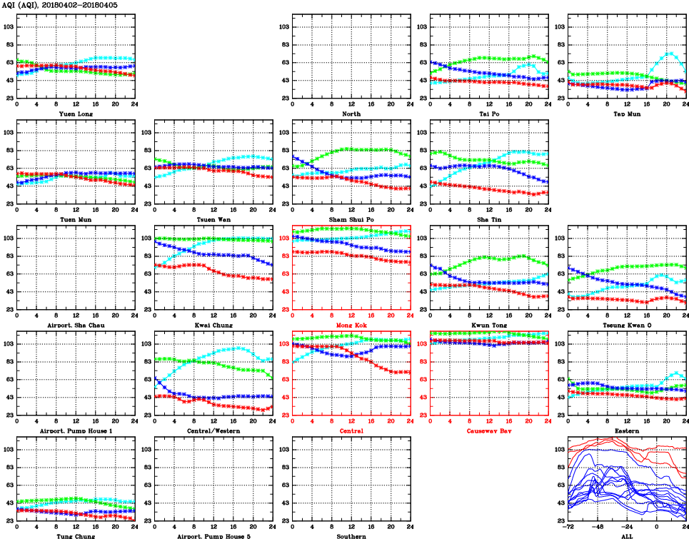 | Air Quality Data Time Series for AQI (2018/04/05) | ( Line colors: Day -3 Day -2 Day -1 Current day ) | 2D Map Current AQHI |