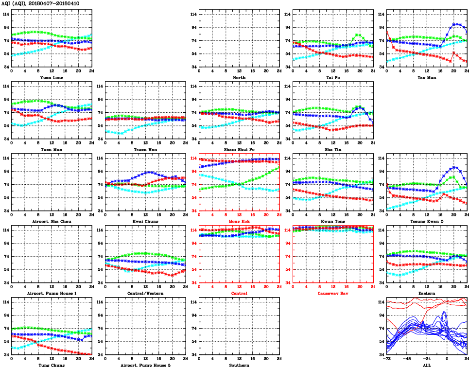| Air Quality Data Time Series for AQI (2018/04/10) | ( Line colors: Day -3 Day -2 Day -1 Current day ) | 2D Map Current AQHI |