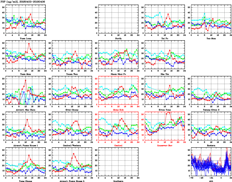 | Air Quality Data Time Series for FSP (2018/04/06) | ( Line colors: Day -3 Day -2 Day -1 Current day ) | 2D Map Current AQHI |