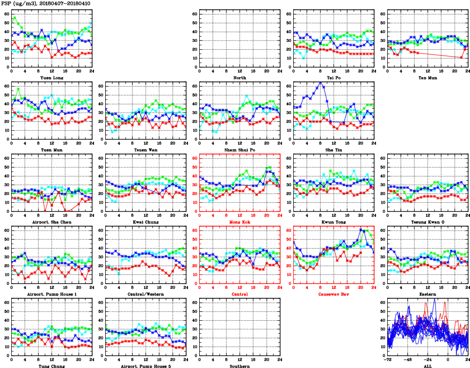 | Air Quality Data Time Series for FSP (2018/04/10) | ( Line colors: Day -3 Day -2 Day -1 Current day ) | 2D Map Current AQHI |