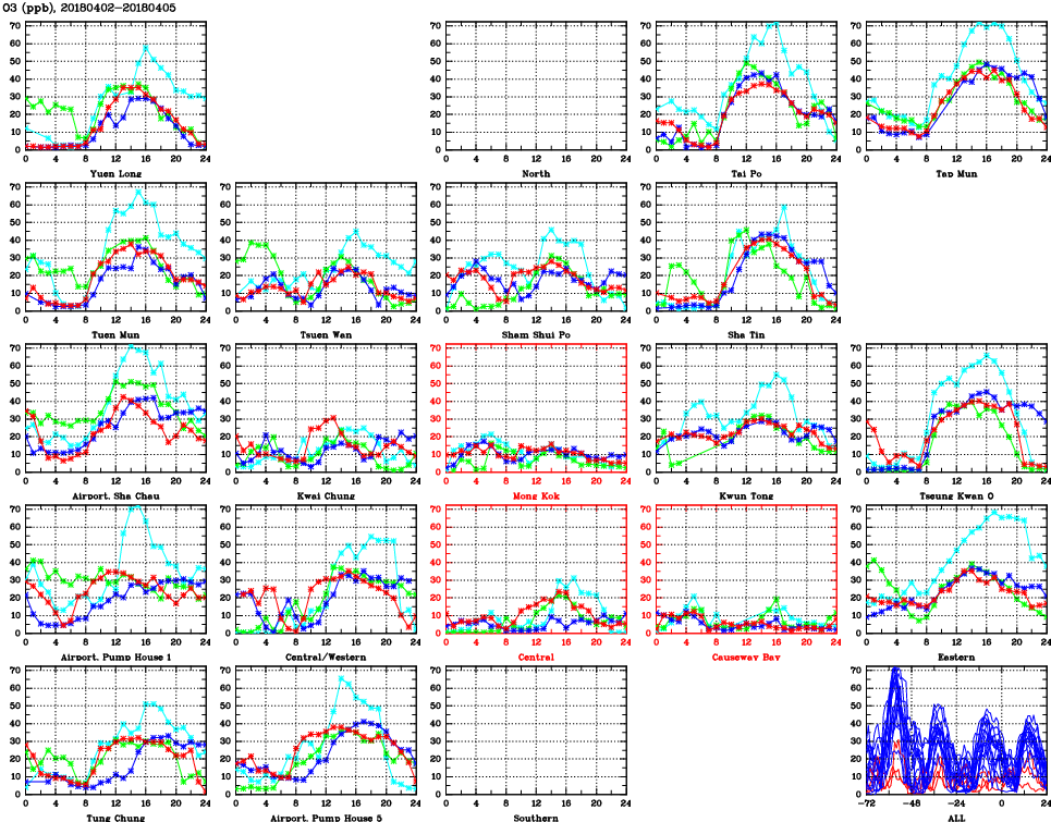| Air Quality Data Time Series for O3 (2018/04/05) | ( Line colors: Day -3 Day -2 Day -1 Current day ) | 2D Map Current AQHI |