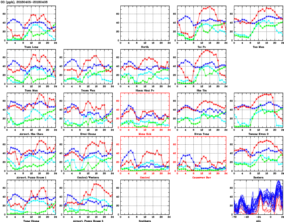 | Air Quality Data Time Series for O3 (2018/04/08) | ( Line colors: Day -3 Day -2 Day -1 Current day ) | 2D Map Current AQHI |